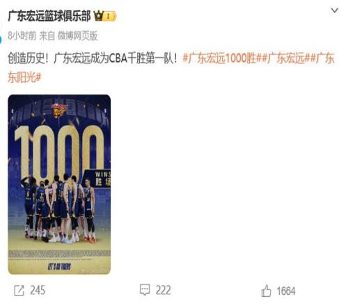 面对CBA本赛季战绩最差的副班长四川男篮,广东队这次没有手软,在轮休了萨姆纳和杜润旺的情况下,依靠三大主力胡明轩、奎因、萨林杰合力砍下的80分,客场以104-76大胜四川,结束2连败的同时,球队也收获了一场极具里程碑意义的胜利,拿到了俱乐部成立以来的第1000场胜利,也是CBA历史上第一支达到此成就的球队,赛后,广东队官方晒出了庆祝海报。